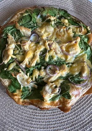 Đặt một chiếc bánh tortilla lên giấy dầuCho rau bina, thịt gà hoặc cá ngừ lên bánh tortilla (tùy theo nguyên liệu bạn muốn chế biến), đổ 2 quả trứng