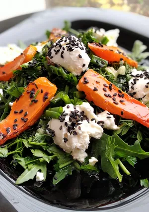 Rửa sạch rau xanh, cho rau arugula nguyên quả vào đĩa.Cho thì là, hành tây, rau mùi tây thái nhỏ lên trên.Chiên hồng trên chảo nướng, mặt vỏ hướng xuống